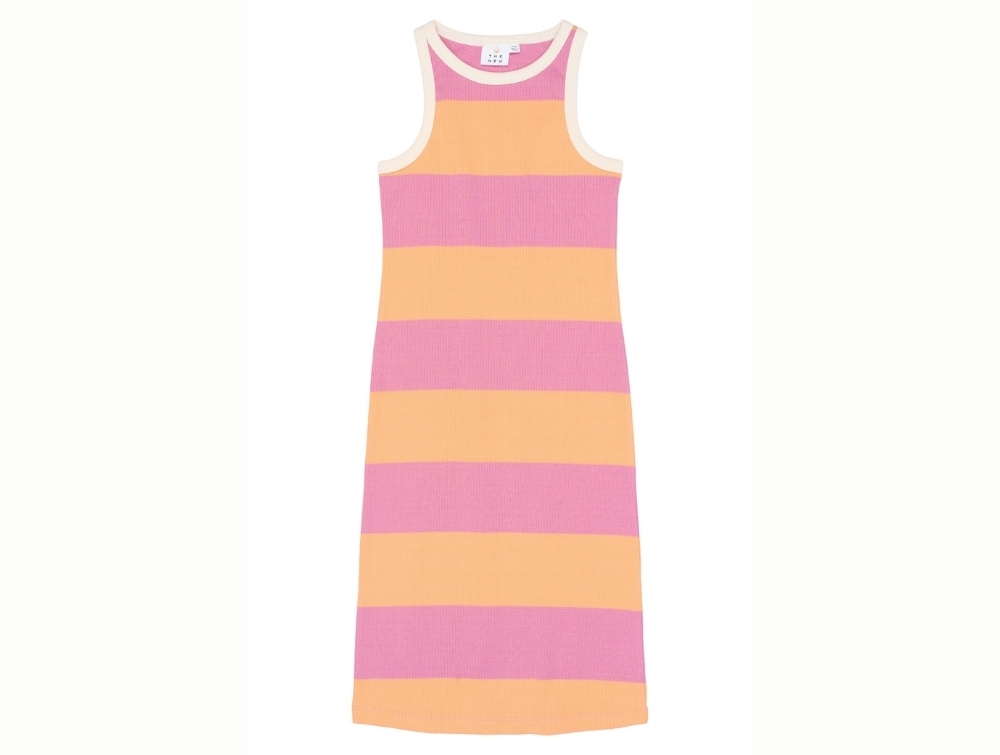 Ribbed dress from THE NEW featuring wide pink (cashmere rose) and orange stripes with an off-white contrast trim.