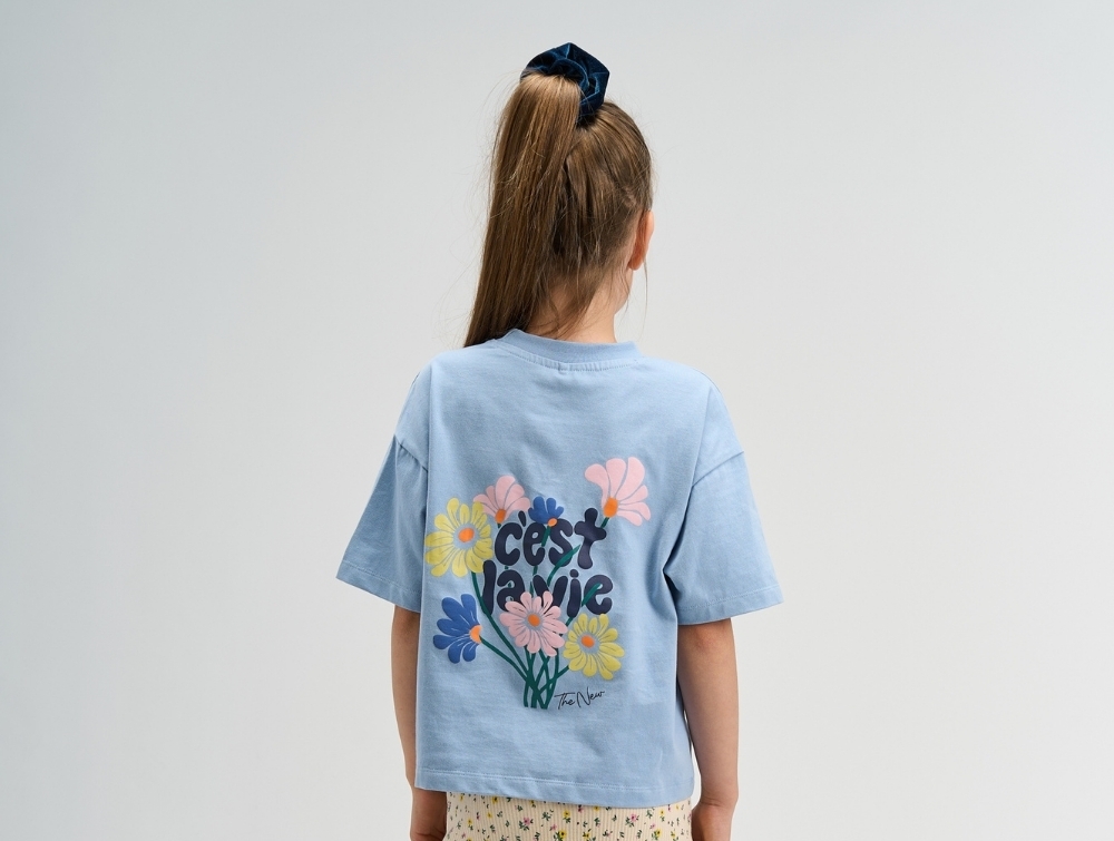T-shirt in a light blue shade (Forever Blue) from THE NEW featuring a large “C’est la vie” floral print on the back and a smaller matching motif on the front.