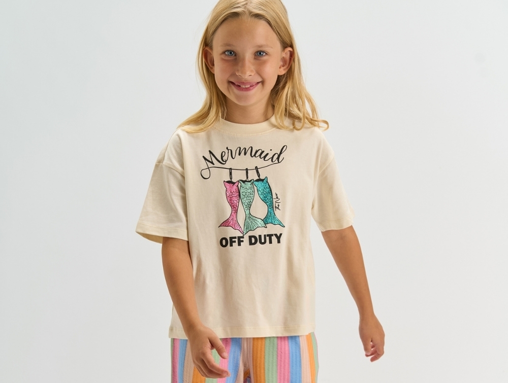 T-shirt in off-white shade (gardenia) from THE NEW featuring a colourful mermaid graphic on the front.