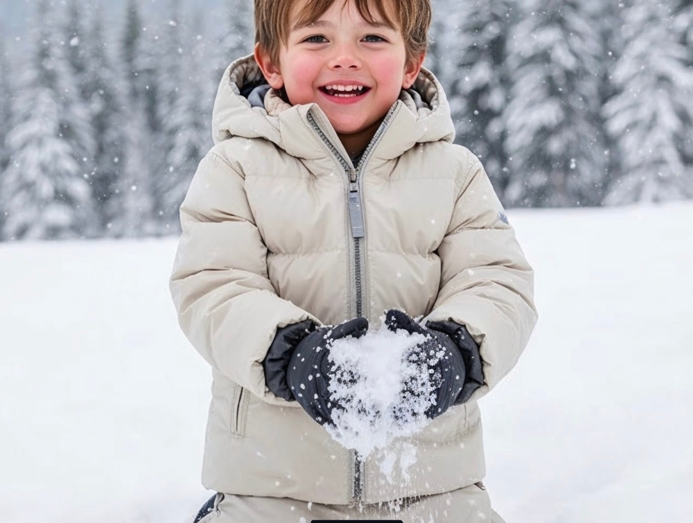 Winter jacket in light beige (oat) from VER de TERRE with soft down filling and detachable hood. The jacket features a practical front zipper and two zippered pockets with grey details. Perfect for cold weather and fits small children well.