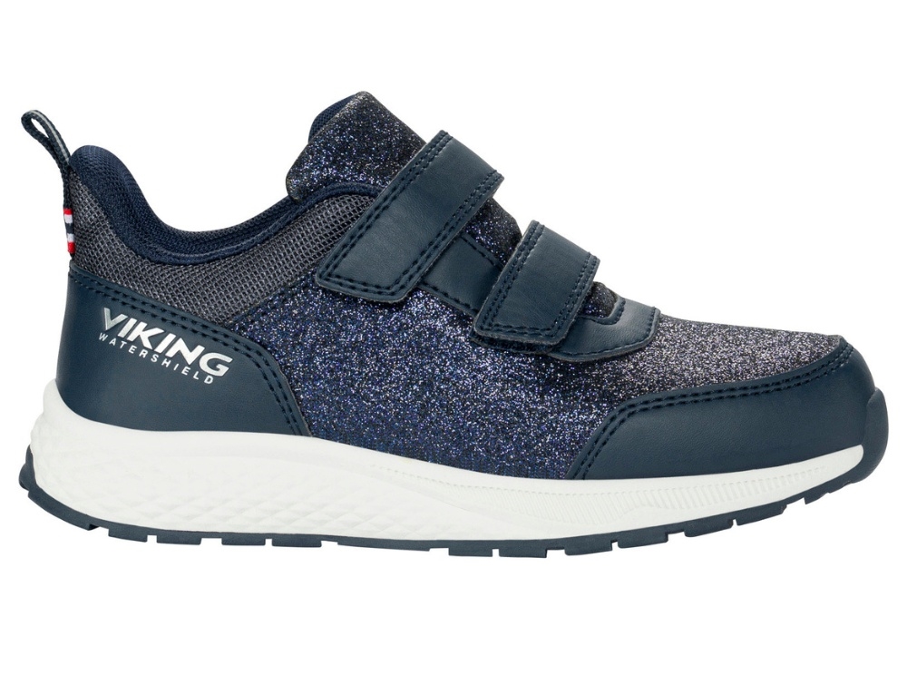 Sneaker in a blue shade with glitter from Viking featuring double velcro closure and a waterproof construction. The model is lightweight and designed for active everyday use.