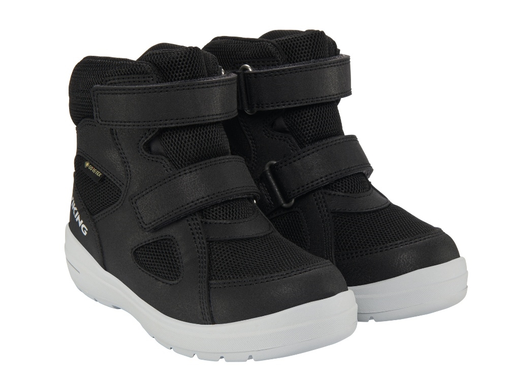 Viking winter boot for children in a classic black design, combining a sporty look with high functionality. The upper is made of textile and synthetic material, while a waterproof GORE-TEX membrane ensures dry feet in all kinds of weather. The boot has a mid-high shaft, double velcro straps and an ergonomic fit, making it easy for kids to put on and take off by themselves.