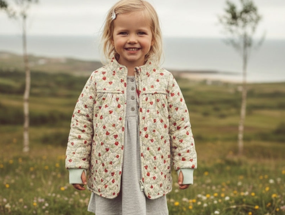 Thermal jacket with strawberry print from Wheat. The jacket has two pockets.