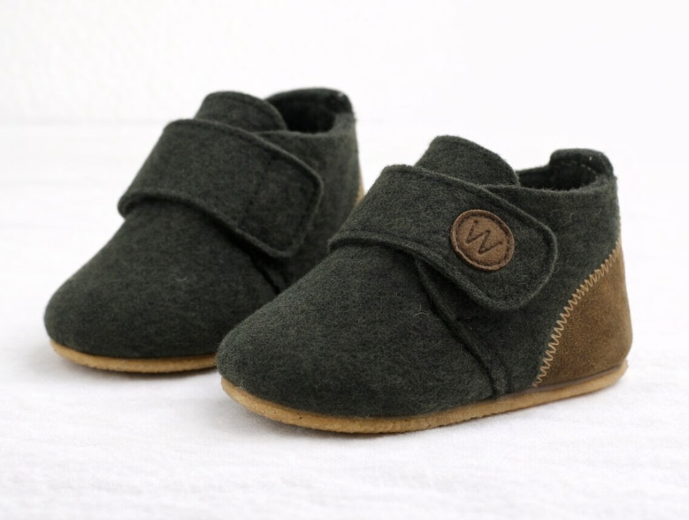 Brown soft leather slippers from Pom Pom. Flexible anti-skid rubber outsole and easy velcro closure.